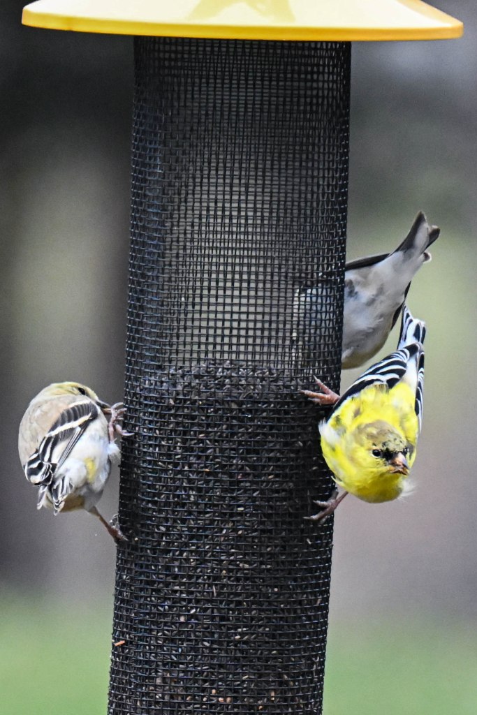 Well yes, that IS a goldfinch who MIGHT have a yellow feather showing, but no, what about the big black blob? What do you see?