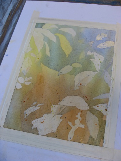 This is one of the pieces I didn’t have time to finish while at the water color pouring workshop in Tucson. It’s a pot with bogenvilla spilling out of it. The concept is to draw the image, then pour paint over the image, mask off some of the light shades, then pour again. At this point it probably has about four pours. All the paintings look great with the masking on, but when it comes off you can be disappointed because the colors are lighter, as the masking gets covered over again and again with paint. I had this and one other which is at a similar point shipped home. The teacher says I need at least one more pour (I think I did two more after this picture) and then I can scrub off the mask and see what’s there. I don’t know if I want to know!