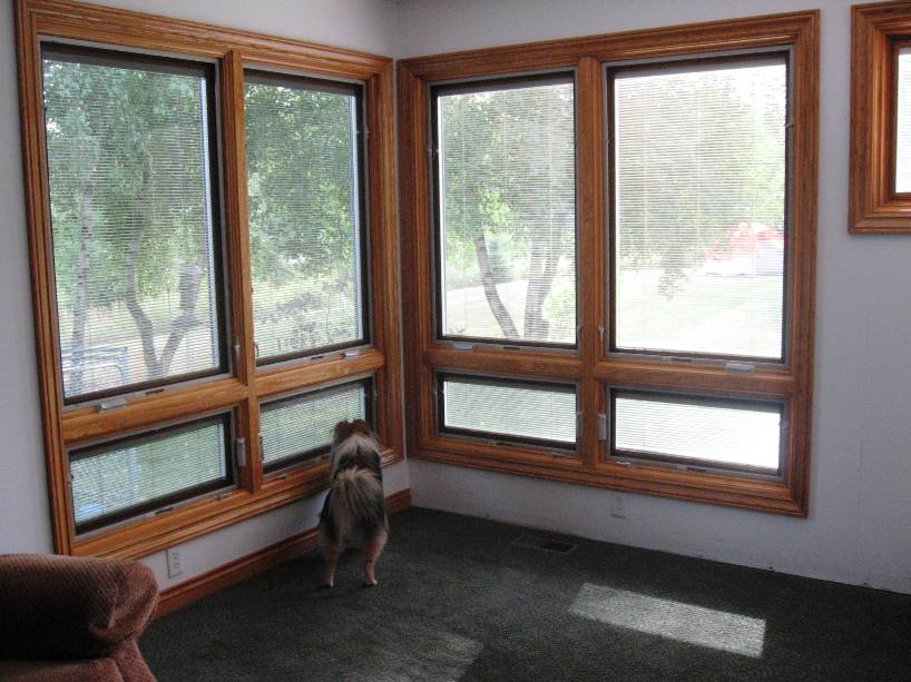 The past two days have been busy. We had several new windows installed which caused the disruption of the entire house. It was worth it however, as the new windows are beautiful, more energy efficient, and they have blinds between the glass so that I can close them to hide things like deer, skunks and raccoons from Katie. Here is a look at the transformation.