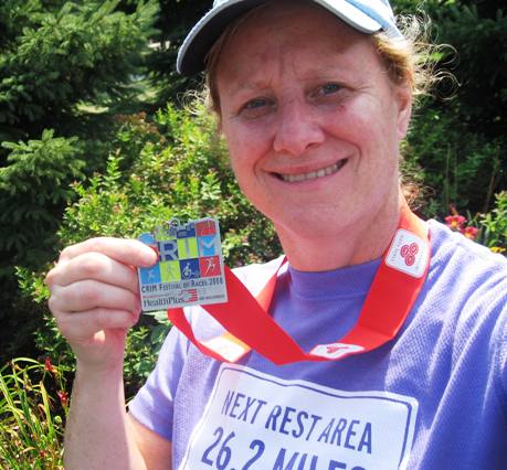 I’m not even sure what my time was, it doesn’t matter. As we turned onto the final road and could see the finish line 4 blocks (downhill) I began to run again. But two blocks into that final push I wanted to stop. What the heck. Just walk. It doesn’t matter. A young lady running next to me said “Don’t stop now, you’re almost there!” and I smiled at her as I was slowing to a stop. She said “NO REALLY! DON’T STOP!” and I kept on running, ran with her the rest of the way in. She said “Congratulations!” and I said “THANK YOU!” and that was the end of my race. I ended it with a run because a complete stranger didn’t give up on me and wouldn’t let me give up on me either. That’s the way it is on the Crim course. It’s a great race, even if it is always hot and humid!