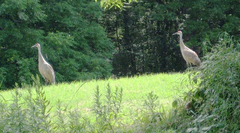 And the best gift from this 12.5 mile run? Noooo…not finishing it…you were going to say that weren’t you! HA! The best gift was rounding a corner and seeing two sand hill cranes standing next to the path. I slowed down and walked (any excuse to stop running!) and eventually passed them. They weren’t much bothered by me. As I passed them one reached up with one foot and scratched his chin. They were the bike path width away from me. And where was my camera? Not on me, which was totally too bad! They were absolutely beautiful close up. The feathers on their chest glowed iridescently and the little red triangle on their head was beautiful. I’m sure they described me to their friends later as that rather large, loud thing in a sweaty shirt and shorts. So since I don’t have a picture of them from my run, here’s a photo of a pair of them that was taken by my brother at the beginning of August. We saw these on one of our trips down to Ann Arbor. Pretend it’s a closeup shot!