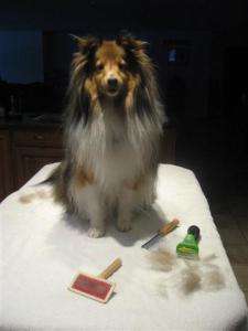 6. Looks like someone was on the torture table (as Reilly likes to call it) I also noticed the furminator on the table and was a bit worried. I was told by my doggie groomer back in Nebraska NOT to use them on a sheltie as they actually cut the top coat while trying to get through to the undercoat. Miss Katie looks beautiful though 🙂
