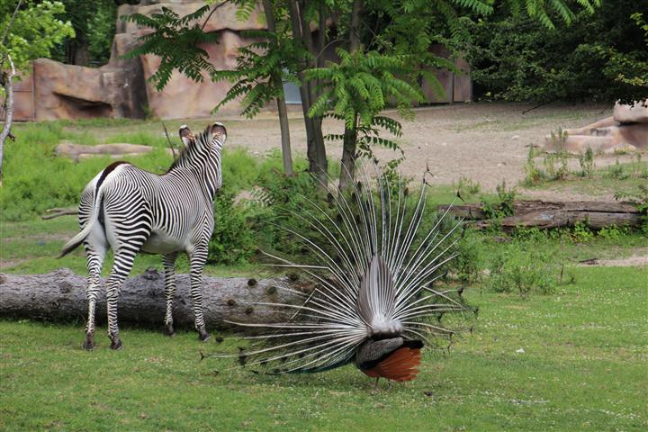 Well, look at that peacock strutting! Zebra seems unimpressive by the extravagent display.