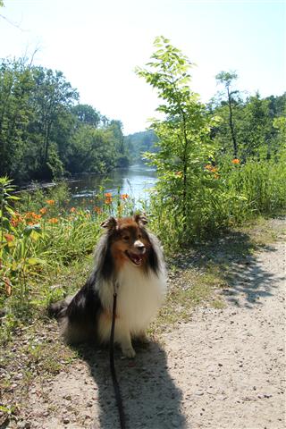 Sunday we went down to Ann Arbor and walked in the Arboretum, a place I had enjoyed while I was in school, a place I still visit from time to time, a place where her grandparents, the ones she never met, have a stone marker. It sits along the Huron River where my Dad used to play when he was a kid. There are lots of trees and walking paths. It’s a perfect place to explore if you’re a sheltie-girl.