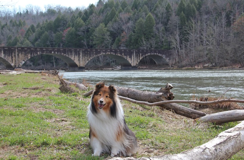 Then I took him to see Cumberland Falls. Mama and I went there too, back in February, on a cold day when the spray from the falls was freezing all over the rocks. I had more fun this time when we got to walk around more…