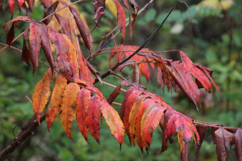 The maple trees, the sumac, and the wild grapes are turning color, but most of the rest of the trees are still green, or just turning brown.