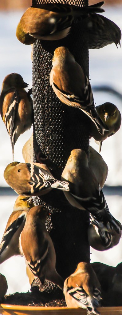 I agree with Bess. I wasn’t quite sure what I was seeing at first. Now that I know, I also know where all the goldfinches are! I haven’t seen any here this winter. Usually there are mobs of them at the thistle feeder, but there hasn’t been so much as one. It’s weird.