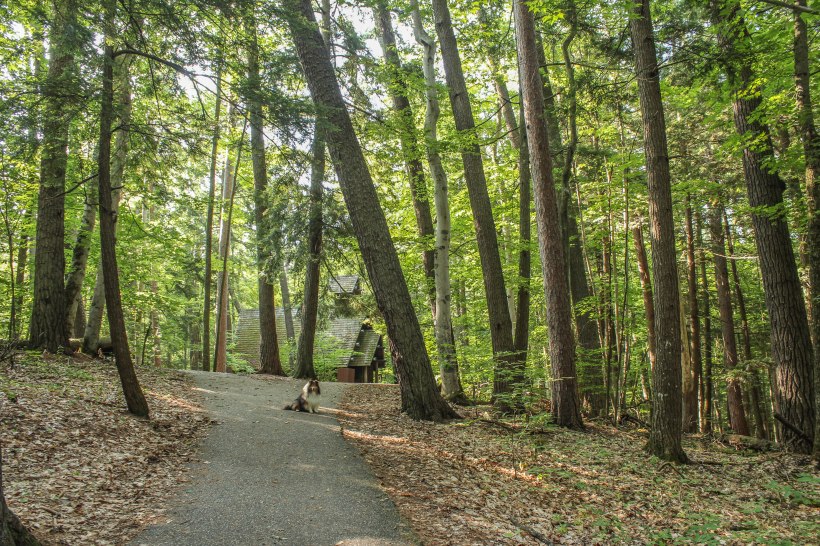 My favorite walk is a paved trail that cuts through huge pine trees. It has a little chapel on a hill that we visit on the way.