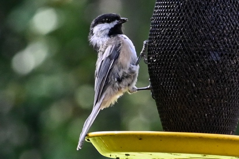 The chickadee stays out of the orioles way by feeding at the finch feeder. I hardly ever see any goldfinches these days, but the chickadee eats plenty.