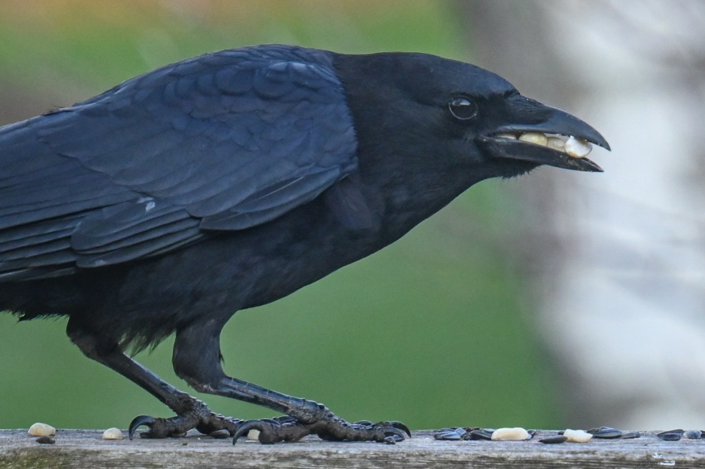 I know. These big crows rarely (as in never) come up and get something to eat, but I’d been feeding everyone (including the squirrels) on the deck railing, so I guess those peanuts were easy pickings.