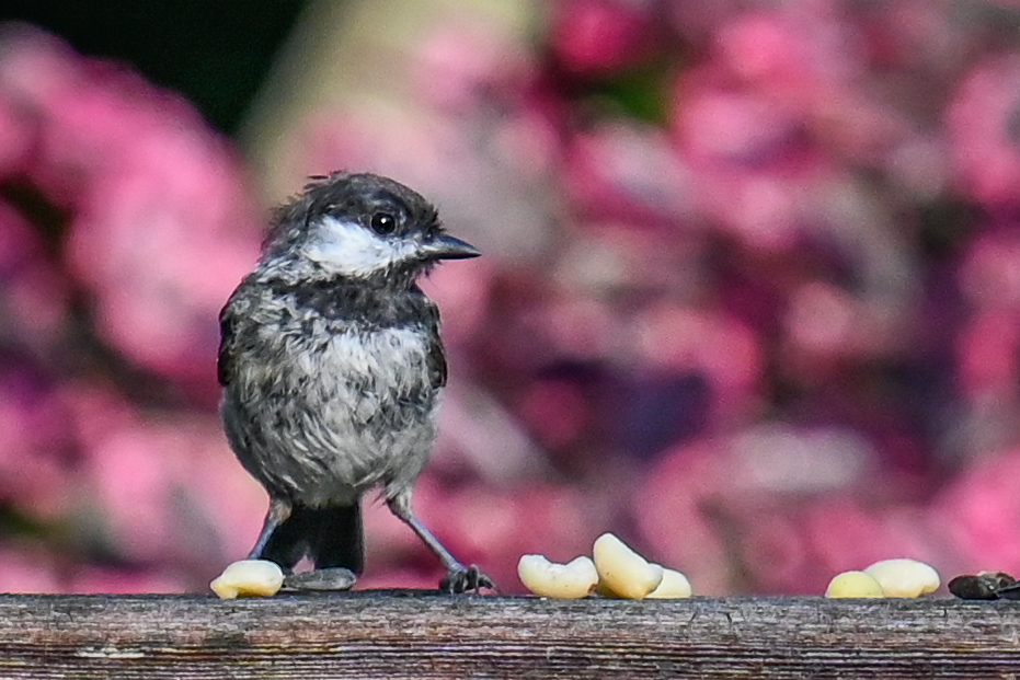 The chickadees have shown up, a whole flock of them this year. As youngsters they were shy, but now they’re old hands at stealing a seed and whirring up into the tree to eat it. There are so many I can’t keep track.
