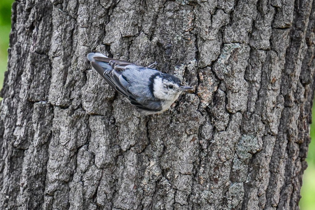 My two nuthatches are the first to arrive. I hear their soft whining before I find them high up in the trees. Each ventures, headfirst, down a trunk, scurrying in a race to reach the seed first.