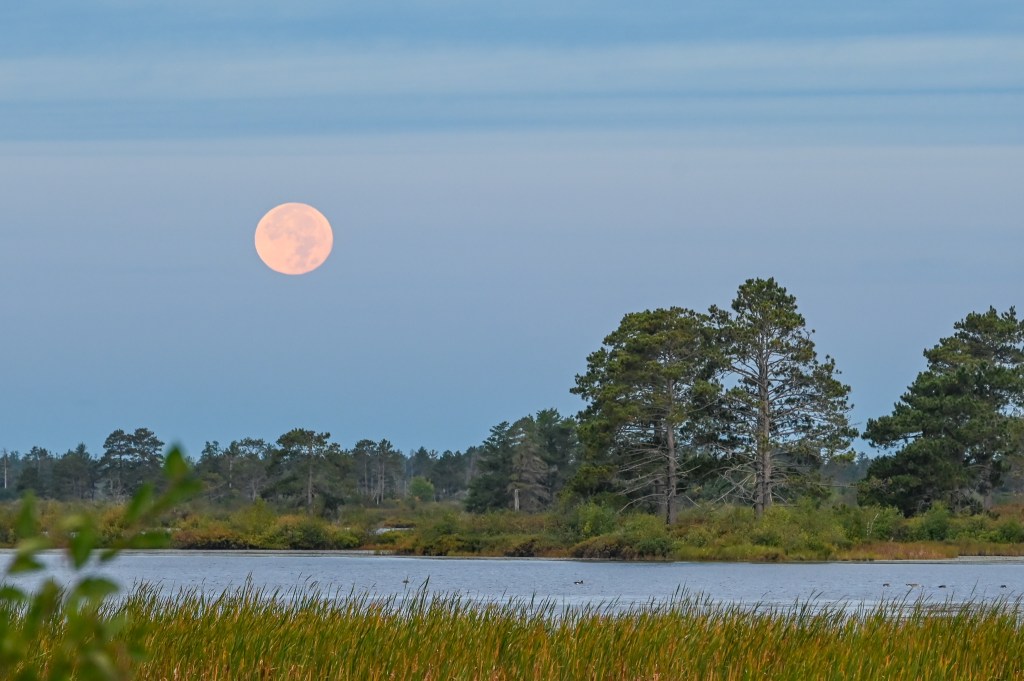 And, as you saw in yesterday’s Wordless Wednesday, I was treated to the most beautiful full, Harvest Moon setting over the water of the Seney Wildlife Refuge. It was going down just as I got there, and I raced to a place to park and stood there grinning while it sank gracefully into the next day.