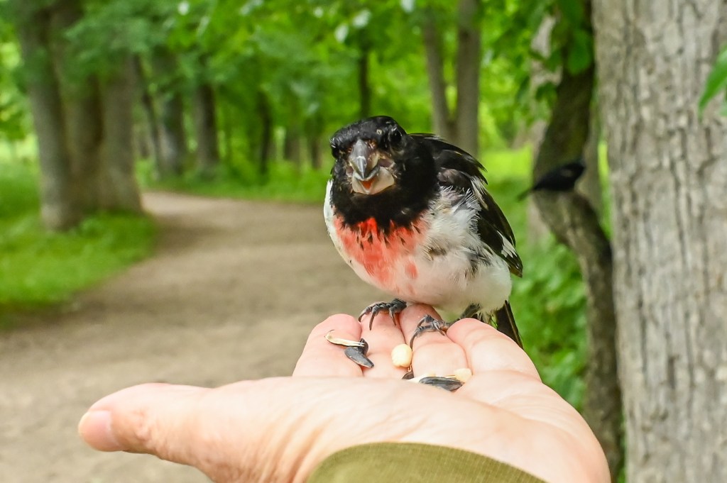 We were still very near the nature center when a rose-breasted grosbeak demanded a treat. This is the first year I’ve ever seen a grosbeak come in for a hand held treat. But these days I often see, on Facebook, a picture of one enjoying himself. It kind of looks like the same bird I’ve fed out there.