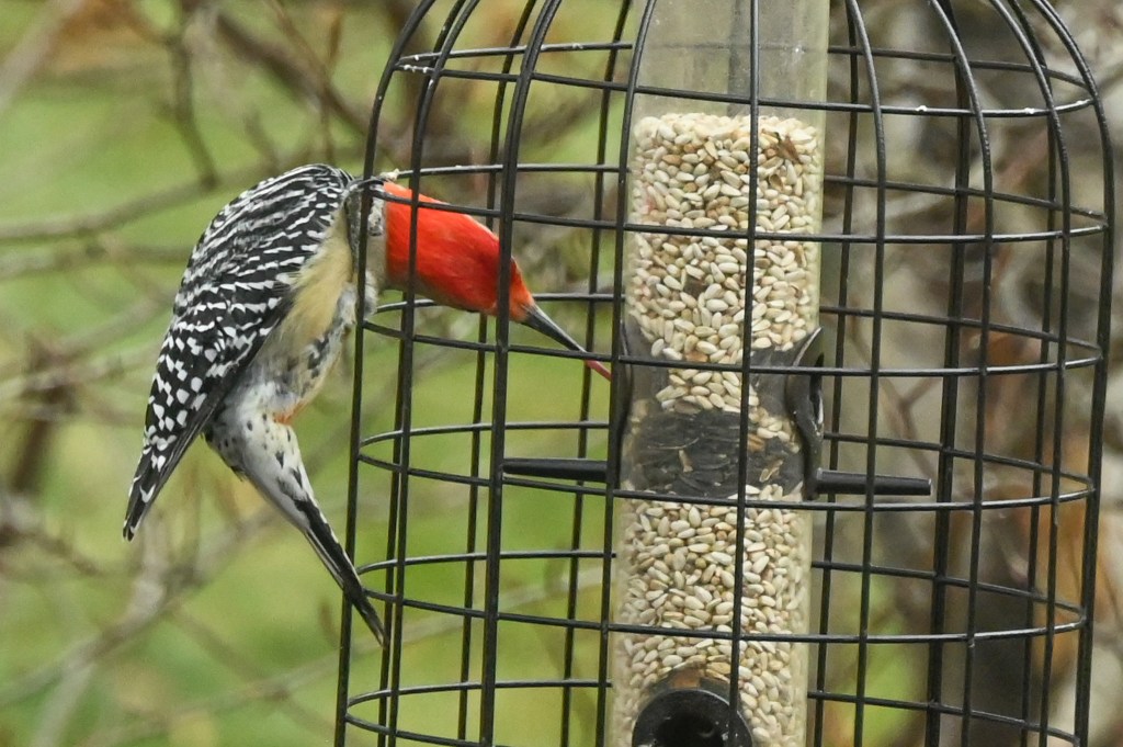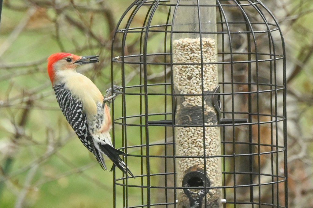 Sometimes they get jealous and try to figure out how to get to the seeds in the caged feeder.