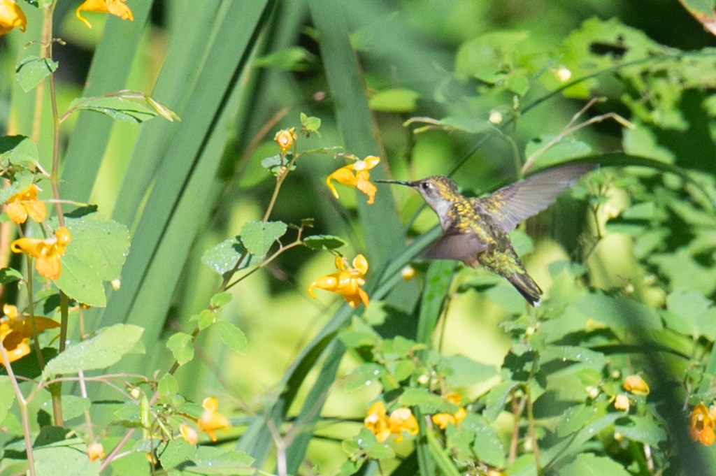 And while I was focused on them I noticed movement out of the corner of my eye, way down at the other end of the bridge. Something fliting around the touch-me-not flowers, far from where I was standing.