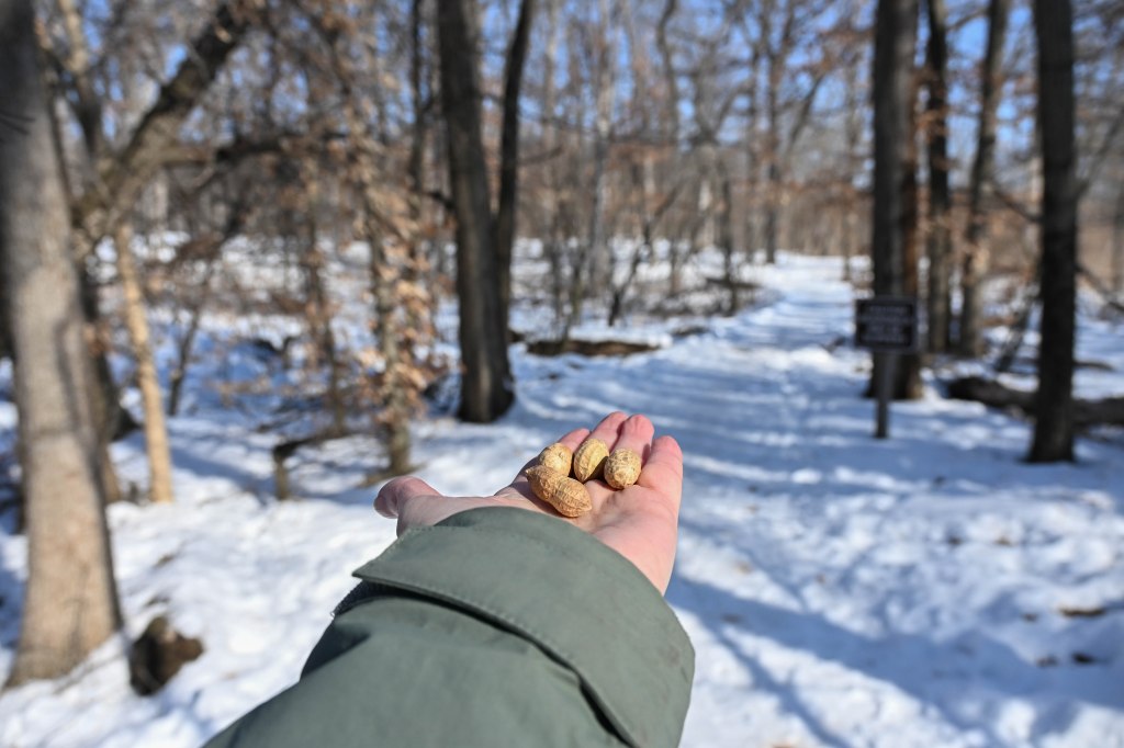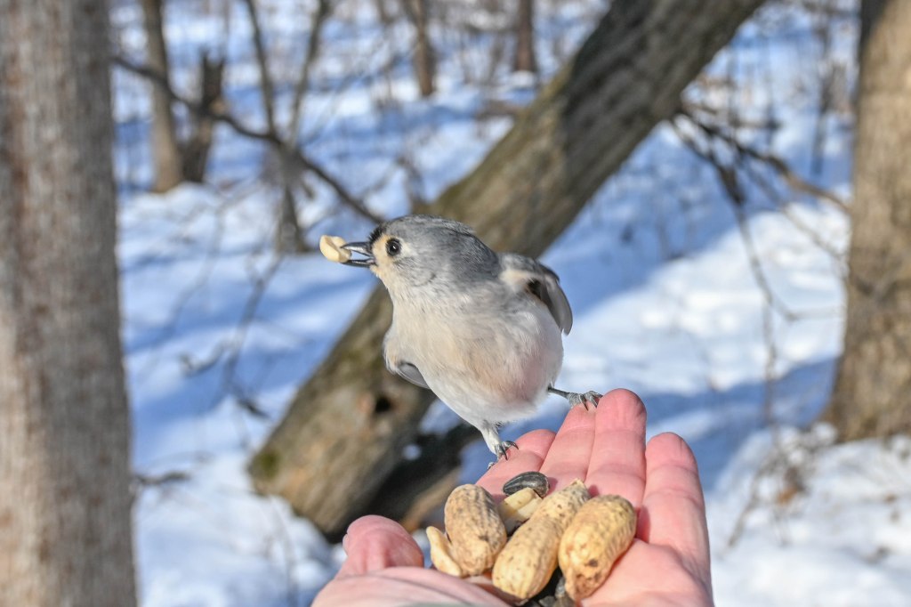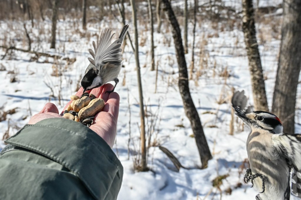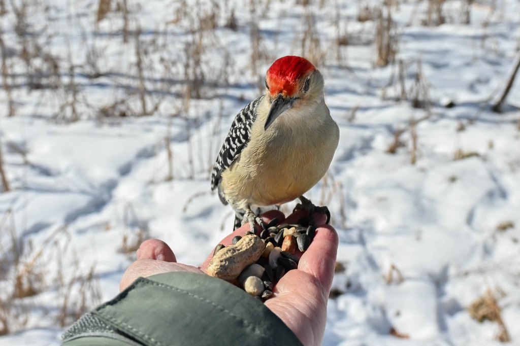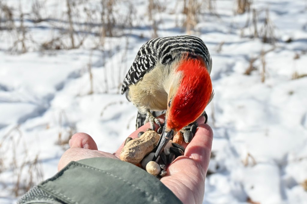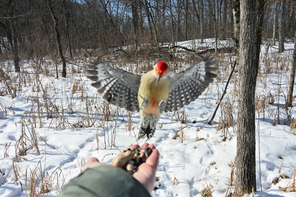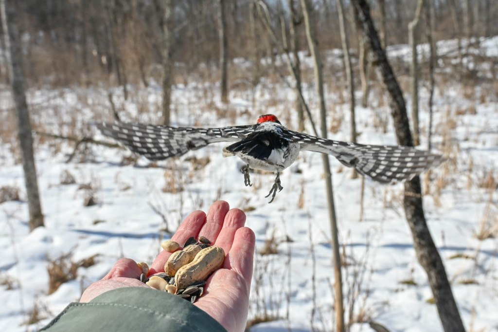 A sandhill crane sunbathing and not wanting to be disturbed.So I didn’t get close. A long lens helps.I found the red-headed woodpecker at his usual corner. Wonder if there’s going to be a nest in there this spring?Meanwhile the little birds were definitely hungry. This is a titmouse. They are so cheeky.A bluejay keeps a careful watch for any spillage.I did spend a lot of time with my hand out hoping to entice the bluejay or the woodpeckers down for brunch.The male downy woodpecker was interested…but uncertain.The titmouse is never uncertain.He got brave.The squirrel enthusiastically enjoyed his treat.A chickadee bops in between titmice.And watching it all is a male red-belly woodpecker. Who really wants a snack but doesn’t want to get too close.Though he works his way down from the tree to get a little closer, keeping his eye on me.Meanwhile the little birds fly in and out, grabbing snacks on the go.And right next to the path, last year’s young sandhill crane is poking around in the mud of a stream.Under the watchful eye of mom and dad. They were both just a bit further up the stream. And they knew exactly where I was.The red-belly supervises it all, including me, from his safe place.Brunch continues with a titmouse grabbing a shelled peanut.Would hunger make this guy brave?Yes!Coming in for a landing.Pursuing the buffet.He makes his selection……and he’s off!Now there was a bit of a traffic jam. Notice the chickadee wing shadow on the downy woodpecker’s chest.The woodpecker won, but the chickadee will be back, see him behind the woodpecker?Taking his snack with him.The red-belly is happy with his score.But wait! Who is this? A FEMALE red-belly waits for a snack of her own.The chickadee tells her off, he’s been displaced once too often already.She waits patiently.But it’s time for me to leave all this drama behind. I move on, leaving seed on the path for everyone to share.