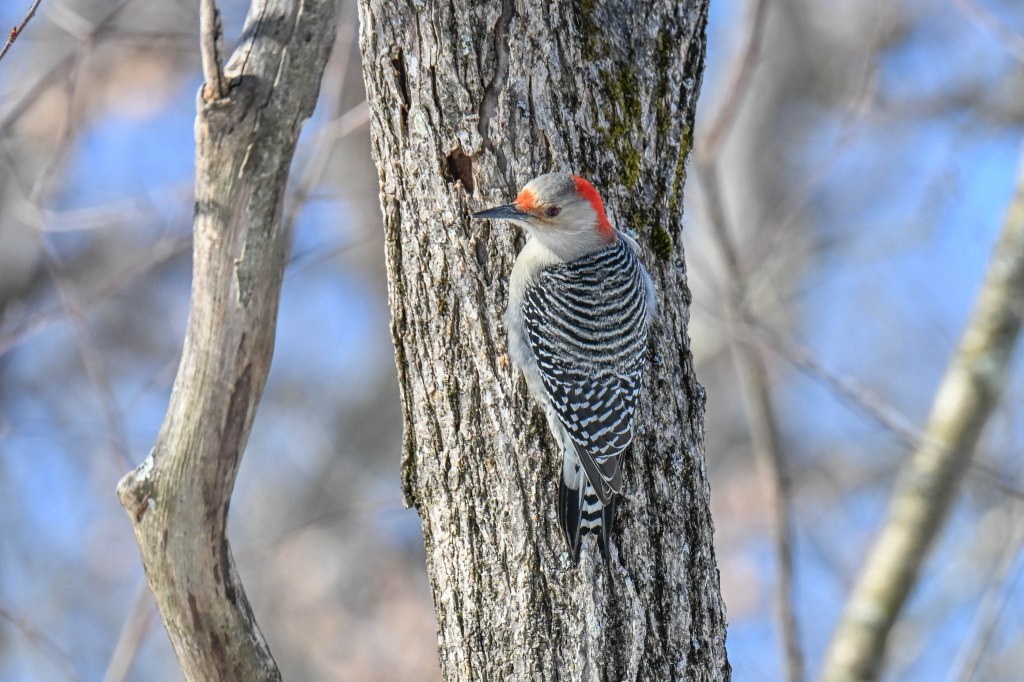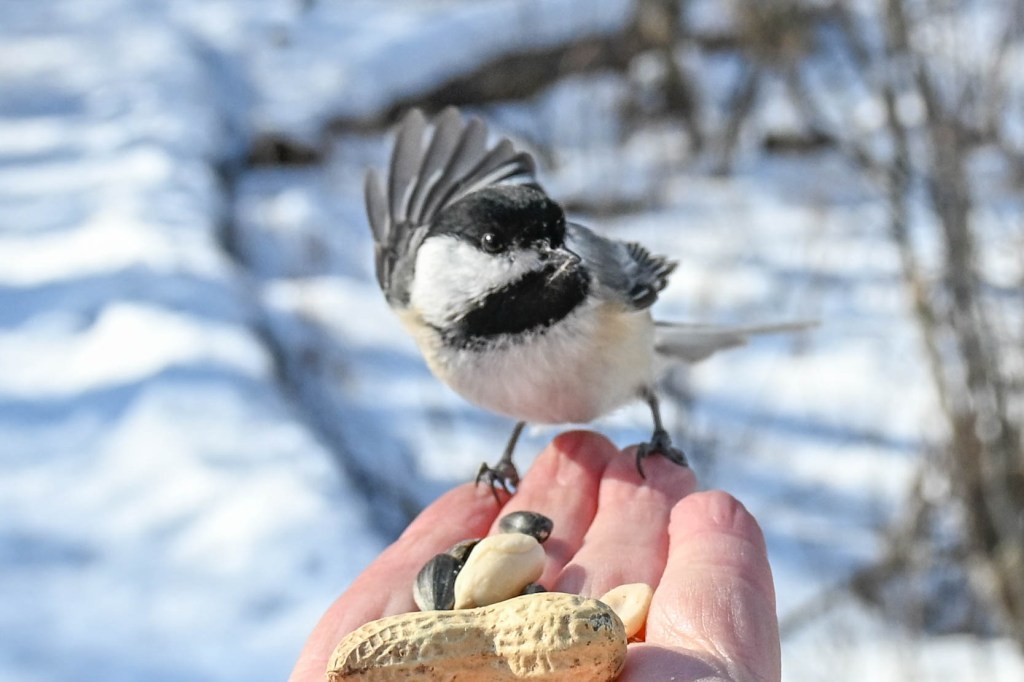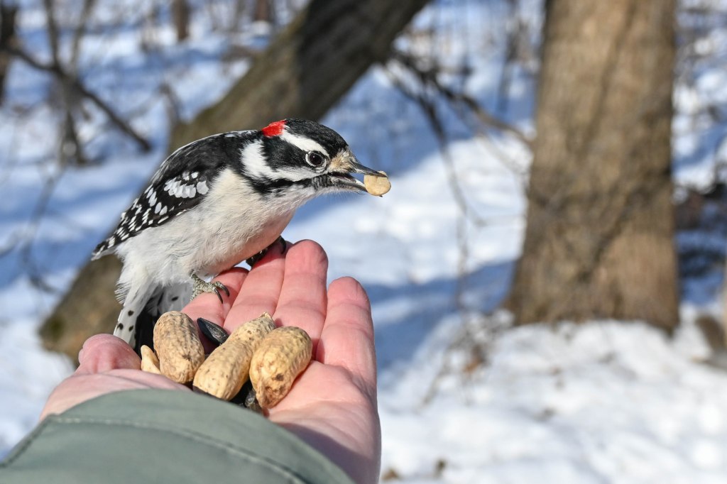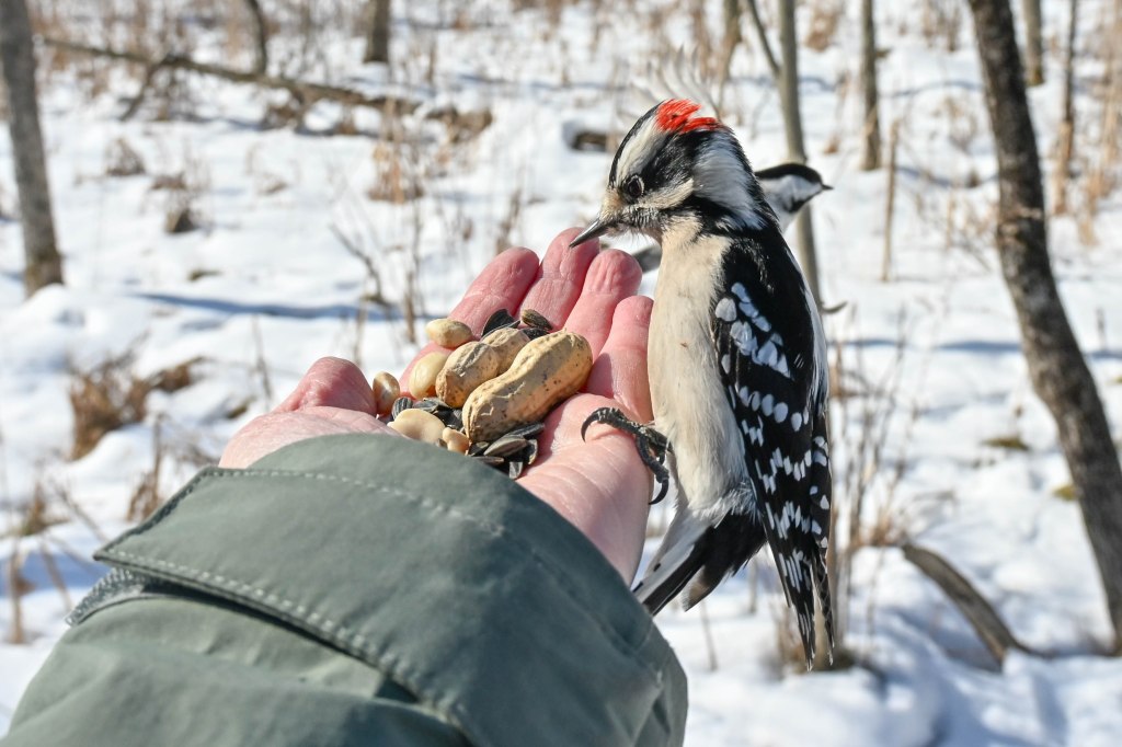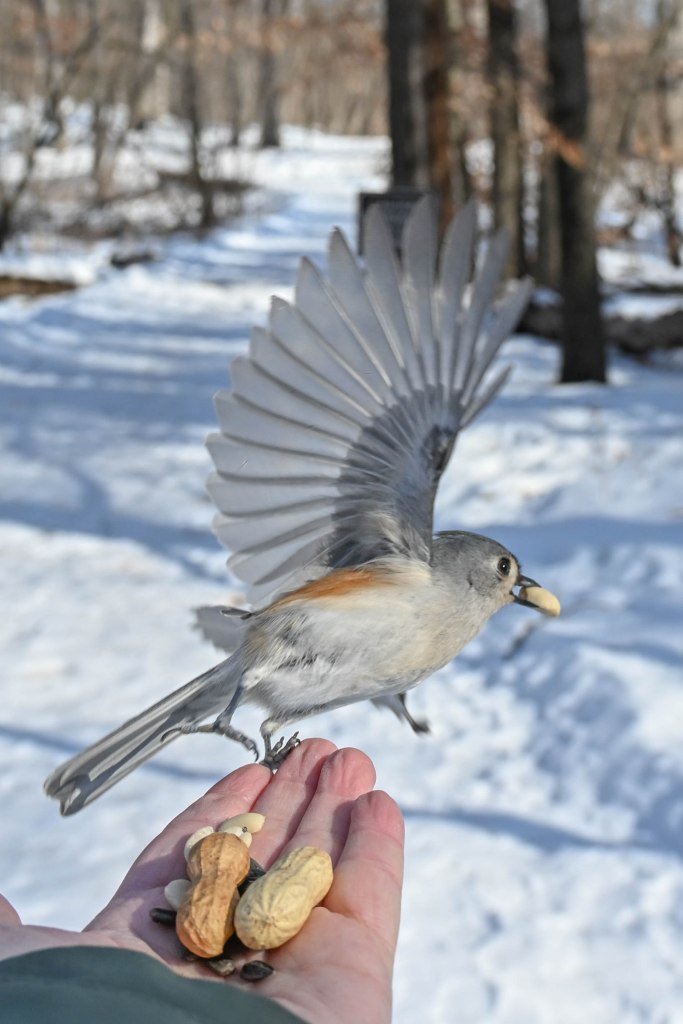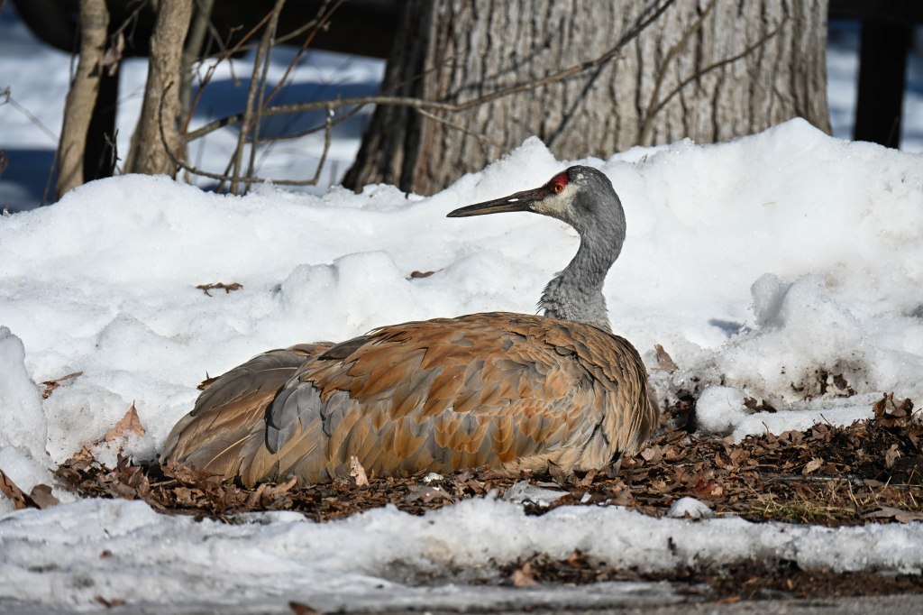 A sandhill crane sunbathing and not wanting to be disturbed.So I didn’t get close. A long lens helps.I found the red-headed woodpecker at his usual corner. Wonder if there’s going to be a nest in there this spring?Meanwhile the little birds were definitely hungry. This is a titmouse. They are so cheeky.A bluejay keeps a careful watch for any spillage.I did spend a lot of time with my hand out hoping to entice the bluejay or the woodpeckers down for brunch.The male downy woodpecker was interested…but uncertain.The titmouse is never uncertain.He got brave.The squirrel enthusiastically enjoyed his treat.A chickadee bops in between titmice.And watching it all is a male red-belly woodpecker. Who really wants a snack but doesn’t want to get too close.Though he works his way down from the tree to get a little closer, keeping his eye on me.Meanwhile the little birds fly in and out, grabbing snacks on the go.And right next to the path, last year’s young sandhill crane is poking around in the mud of a stream.Under the watchful eye of mom and dad. They were both just a bit further up the stream. And they knew exactly where I was.The red-belly supervises it all, including me, from his safe place.Brunch continues with a titmouse grabbing a shelled peanut.Would hunger make this guy brave?Yes!Coming in for a landing.Pursuing the buffet.He makes his selection……and he’s off!Now there was a bit of a traffic jam. Notice the chickadee wing shadow on the downy woodpecker’s chest.The woodpecker won, but the chickadee will be back, see him behind the woodpecker?Taking his snack with him.The red-belly is happy with his score.But wait! Who is this? A FEMALE red-belly waits for a snack of her own.The chickadee tells her off, he’s been displaced once too often already.She waits patiently.But it’s time for me to leave all this drama behind. I move on, leaving seed on the path for everyone to share.