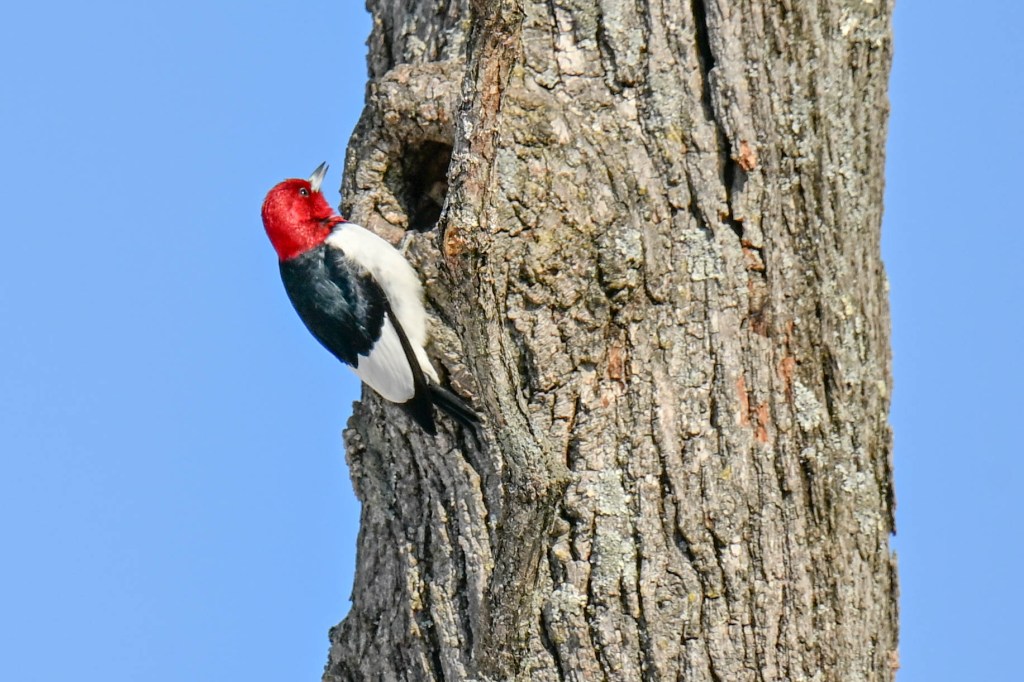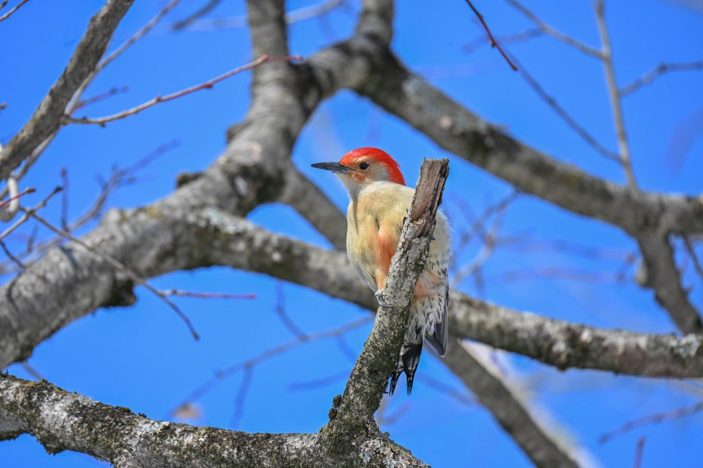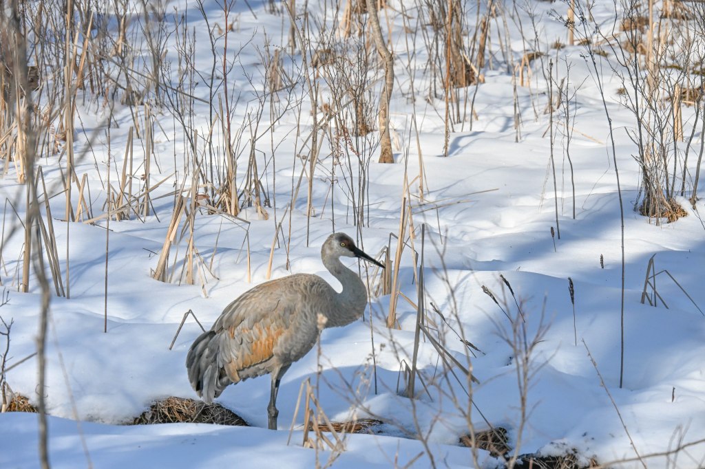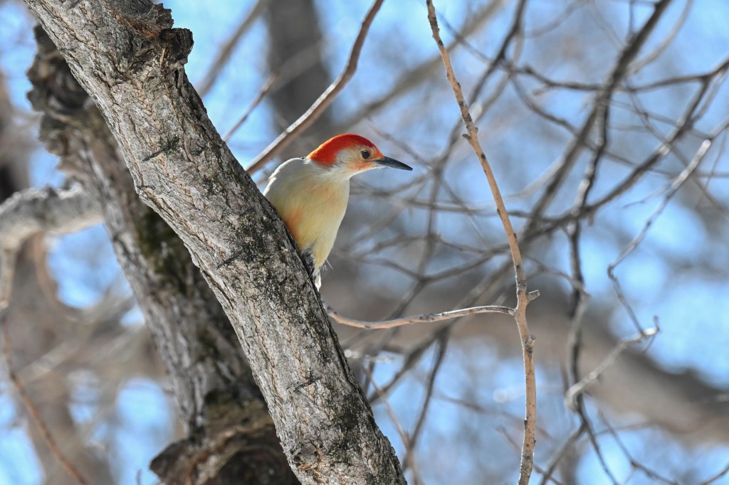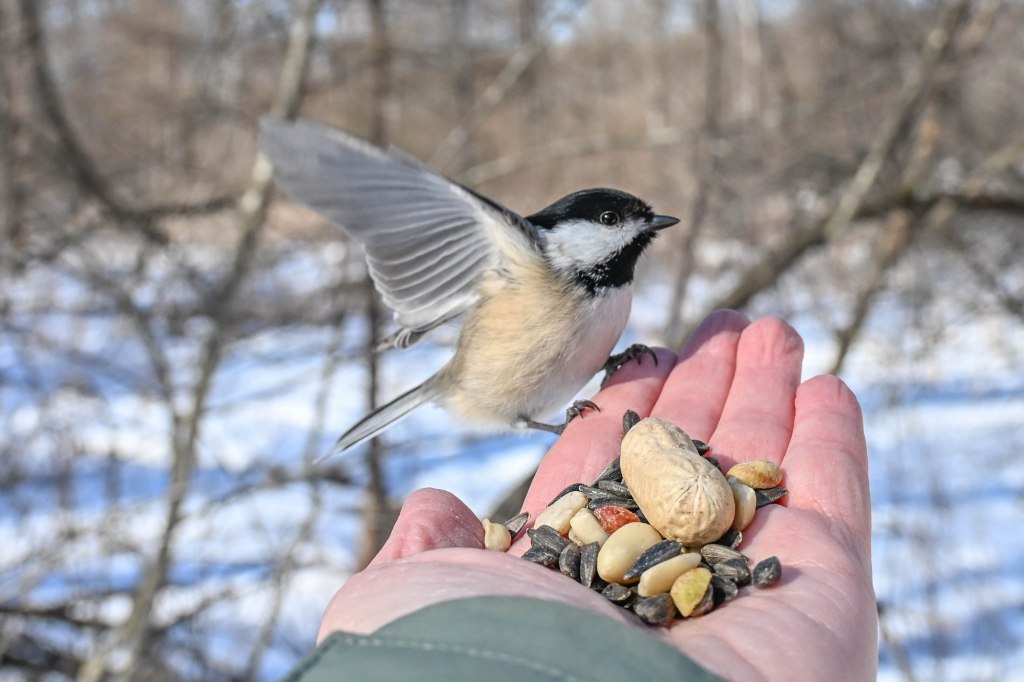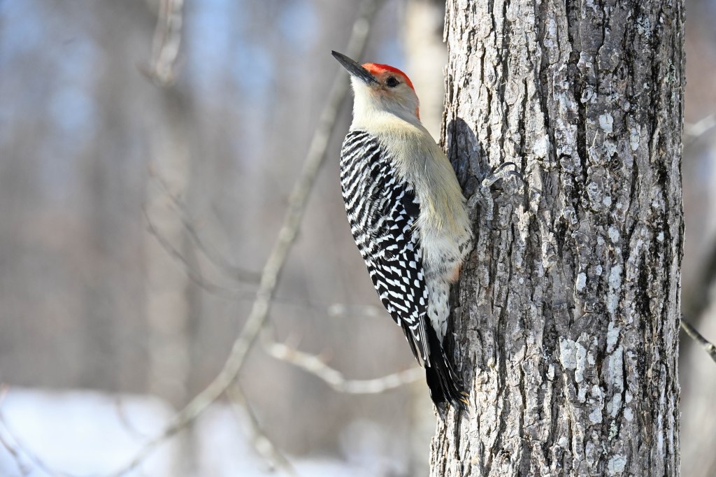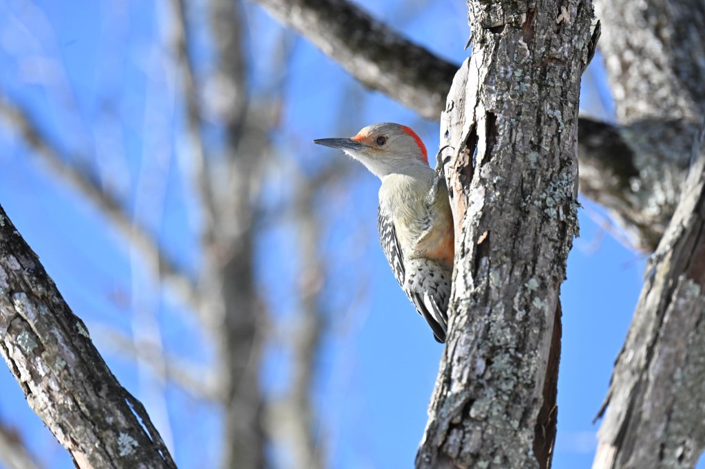 A sandhill crane sunbathing and not wanting to be disturbed.So I didn’t get close. A long lens helps.I found the red-headed woodpecker at his usual corner. Wonder if there’s going to be a nest in there this spring?Meanwhile the little birds were definitely hungry. This is a titmouse. They are so cheeky.A bluejay keeps a careful watch for any spillage.I did spend a lot of time with my hand out hoping to entice the bluejay or the woodpeckers down for brunch.The male downy woodpecker was interested…but uncertain.The titmouse is never uncertain.He got brave.The squirrel enthusiastically enjoyed his treat.A chickadee bops in between titmice.And watching it all is a male red-belly woodpecker. Who really wants a snack but doesn’t want to get too close.Though he works his way down from the tree to get a little closer, keeping his eye on me.Meanwhile the little birds fly in and out, grabbing snacks on the go.And right next to the path, last year’s young sandhill crane is poking around in the mud of a stream.Under the watchful eye of mom and dad. They were both just a bit further up the stream. And they knew exactly where I was.The red-belly supervises it all, including me, from his safe place.Brunch continues with a titmouse grabbing a shelled peanut.Would hunger make this guy brave?Yes!Coming in for a landing.Pursuing the buffet.He makes his selection……and he’s off!Now there was a bit of a traffic jam. Notice the chickadee wing shadow on the downy woodpecker’s chest.The woodpecker won, but the chickadee will be back, see him behind the woodpecker?Taking his snack with him.The red-belly is happy with his score.But wait! Who is this? A FEMALE red-belly waits for a snack of her own.The chickadee tells her off, he’s been displaced once too often already.She waits patiently.But it’s time for me to leave all this drama behind. I move on, leaving seed on the path for everyone to share.