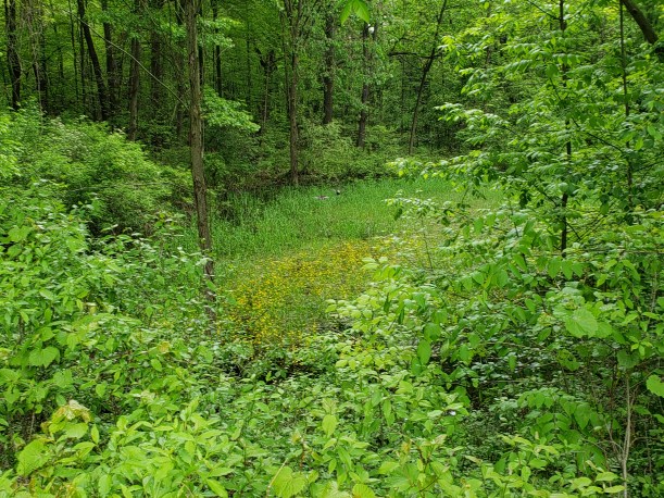 During mile five I concentrated on getting along faster. That one rain drop had been a warning, and I knew it could be a downpour at any moment. But I stopped to take a picture of a swath of yellow flowers down in a swampy area. I don’t know what the flowers are, but I was pleasantly surprised by two duck-like birds that rose up out of them when I took my shot. I don’t know what they were either. They were the size of ducks, but were both dark. I didn’t stay to try and figure it out. Time was ticking, the clouds were rolling, and the mosquitoes were swarming every time I stopped.