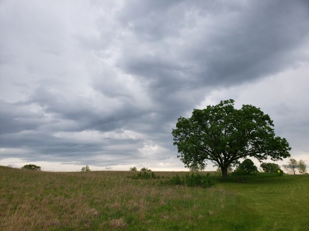 I was watching the sky as I ran through the meadow, making note of ominous clouds way off to the west. As I hit the four mile marker I felt the first drop of rain. Of course. I was the furthest from the car that I could be. Wouldn’t matter if I turned around and went back or kept going forward, the distance would be the same. I kept going and smiled at a woman on a bike going the other way. We both shrugged our shoulders as if to say….”What are you gonna do when it rains, right?” I figured if she hustled she could make it back to the car before the rain truly hit. Me? Well, I ratcheted it up to hobble++.