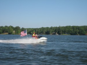 The next morning we took the boat out again, this time to watch the annual jet ski parade on the lake. This year close to 50 jet skis, most decked out with flags and red, white and blue tinsel, gathered near an island, then took off in single file to run the entire circumference of the lake.