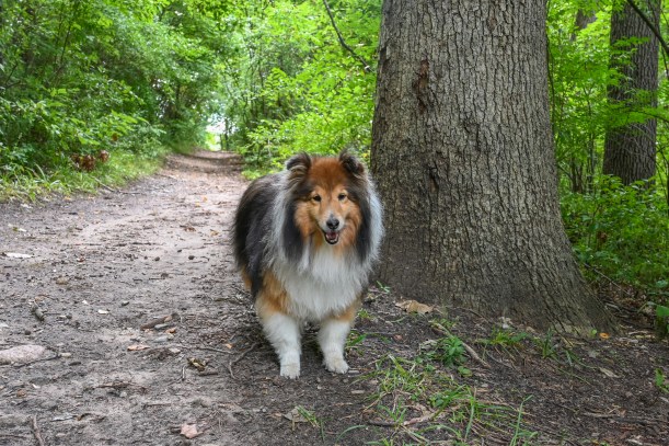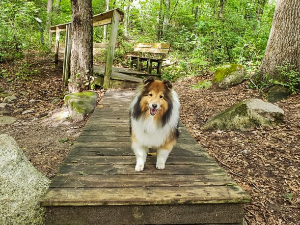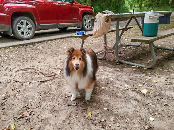 We had a lot of fun. Each walk was pretty short, but I pranced right along, sniffing everything. I love walking in new places with my mom. After each walk we’d go back to our campsite and I’d mostly ignore the towels she provided and instead chose to sleep on the nice cool dirt. Mama spent a lot of her spare time while I was napping reading her book and enjoying the beautiful day.