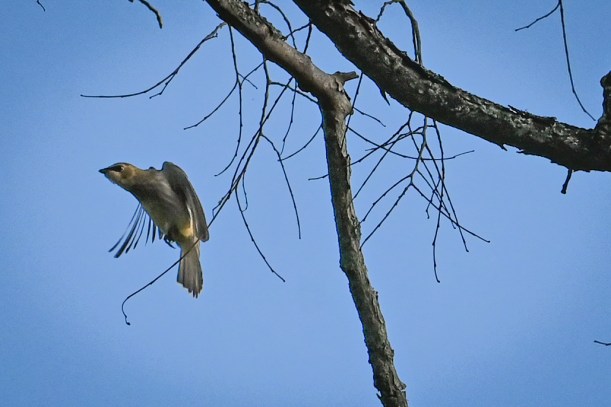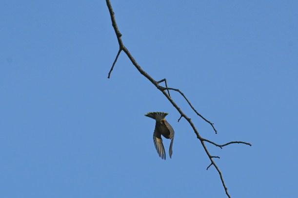 I turned to go, and over my left shoulder three large birds flew by. Three large white birds. Could it be? Yes! They were pelicans! My settings weren’t right for a moving bird, but I got some OK shots.