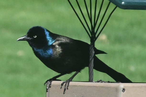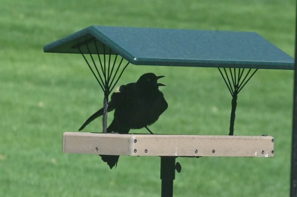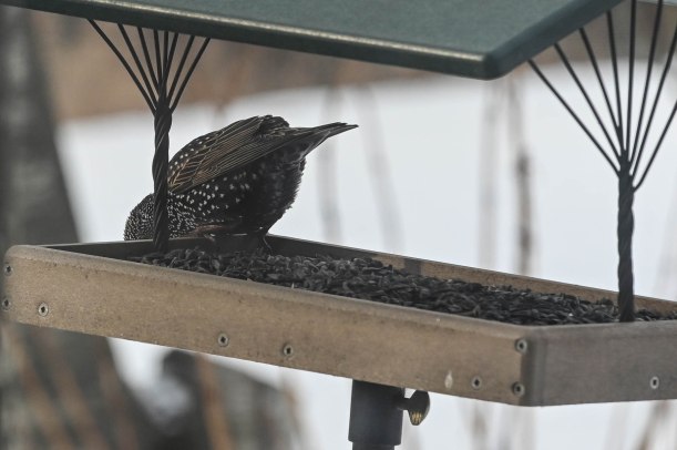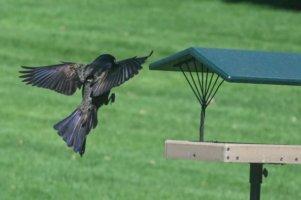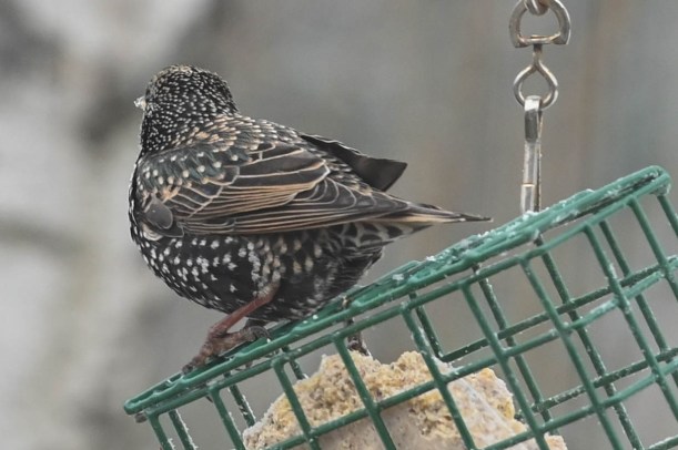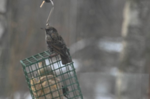 I told her that the blackbirds wouldn’t come sit on our hands, they are always interested in the food happenings but will usually wait around until we move off and then go in for the leftovers. Just as I was saying this a huge blackbird landed on my hand.