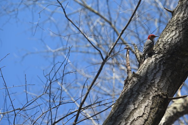 This guy is a red-bellied woodpecker, showing off his red belly.