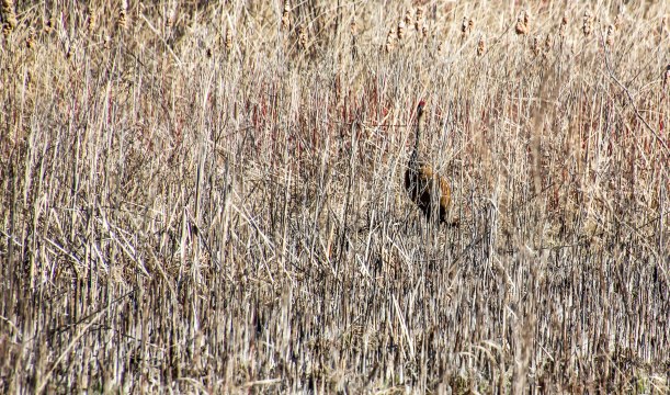 I turned and headed back toward the parking lot. On the way I ran into another cute little woodpecker. He didn’t really want his picture taken so he moved around behind the old cattail reed he was working on.