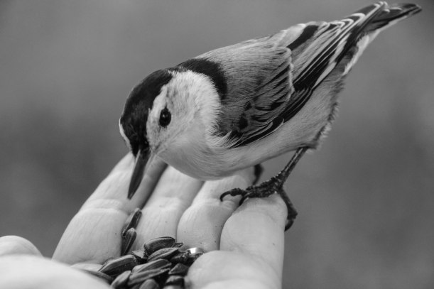 I held out a few seeds and the nuthatch flew in and grabbed one and then quickly flew off to some fallen trees. He did this a couple times, returning to my hand so quick that I didn’t think he was eating the seed. And then I saw him doing this.