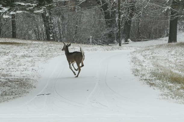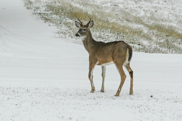 I know it’s the same buck that visited with his girl earlier in the fall. In those photos I noticed a big bloody gash on his back hip. Today I got a shot of him from that side and there’s definitely a healed over wound back there.