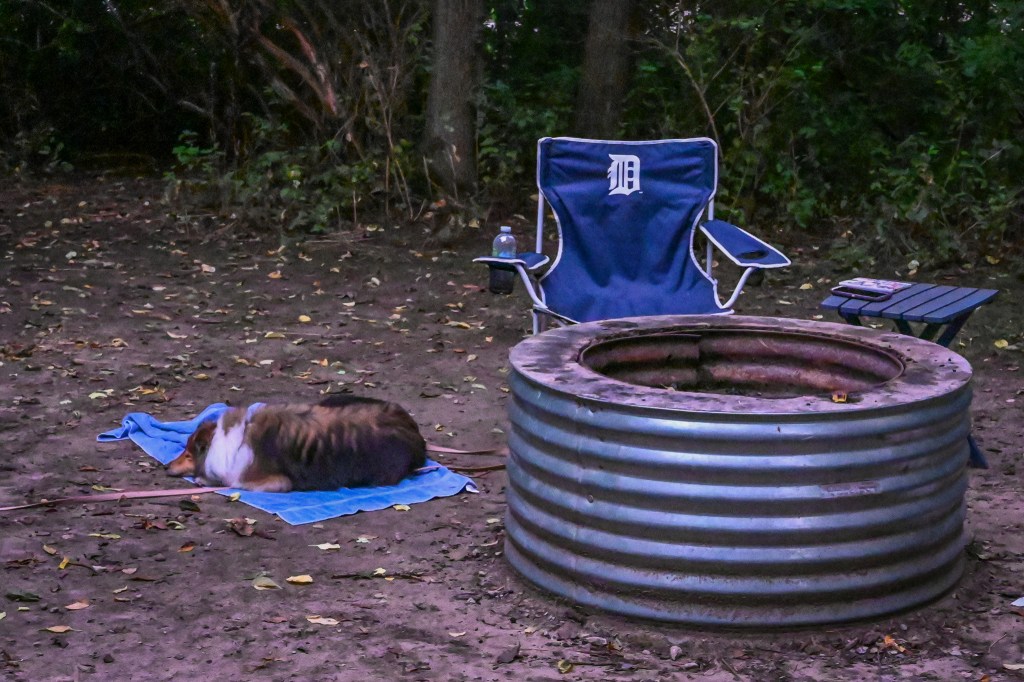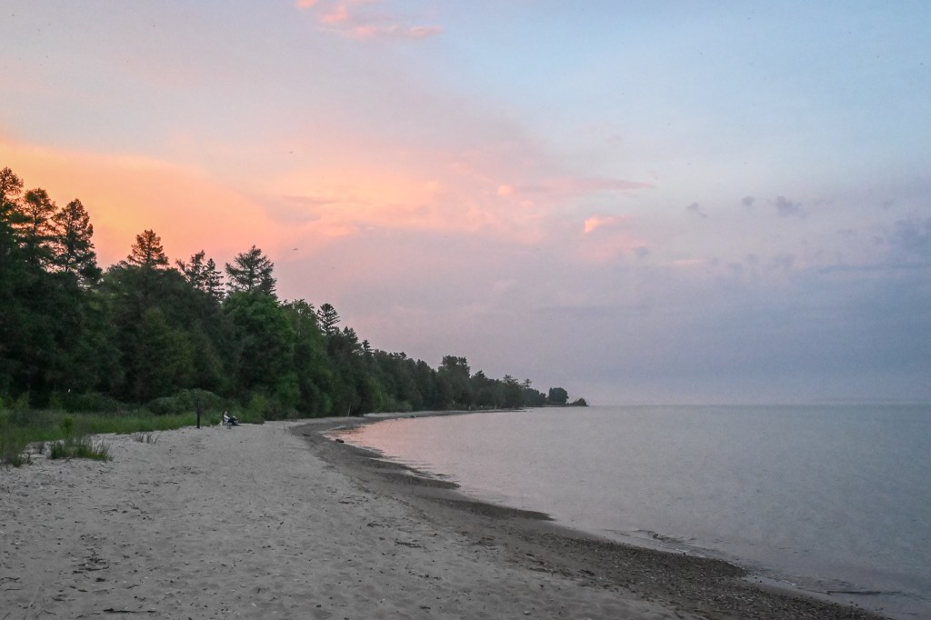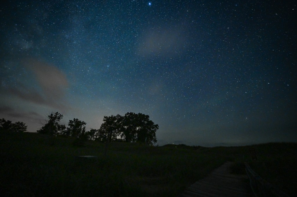 According to my Planit app, the Milky Way would rise high enough to see it over the trees by 2 a.m. But my friend and I went out at midnight, after sitting around the fire all evening waiting for it to get dark, just to check out my chosen site, which was at a park at the mouth of the Platt River, where it empties into Lake Michigan.