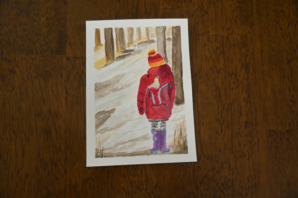 I didn’t have enough confidence to try it back then, but I loved it when I saw the image on her page and thought it would make a really lovely painting. It’s her granddaughter, walking among the pines on one of their many adventures up north.