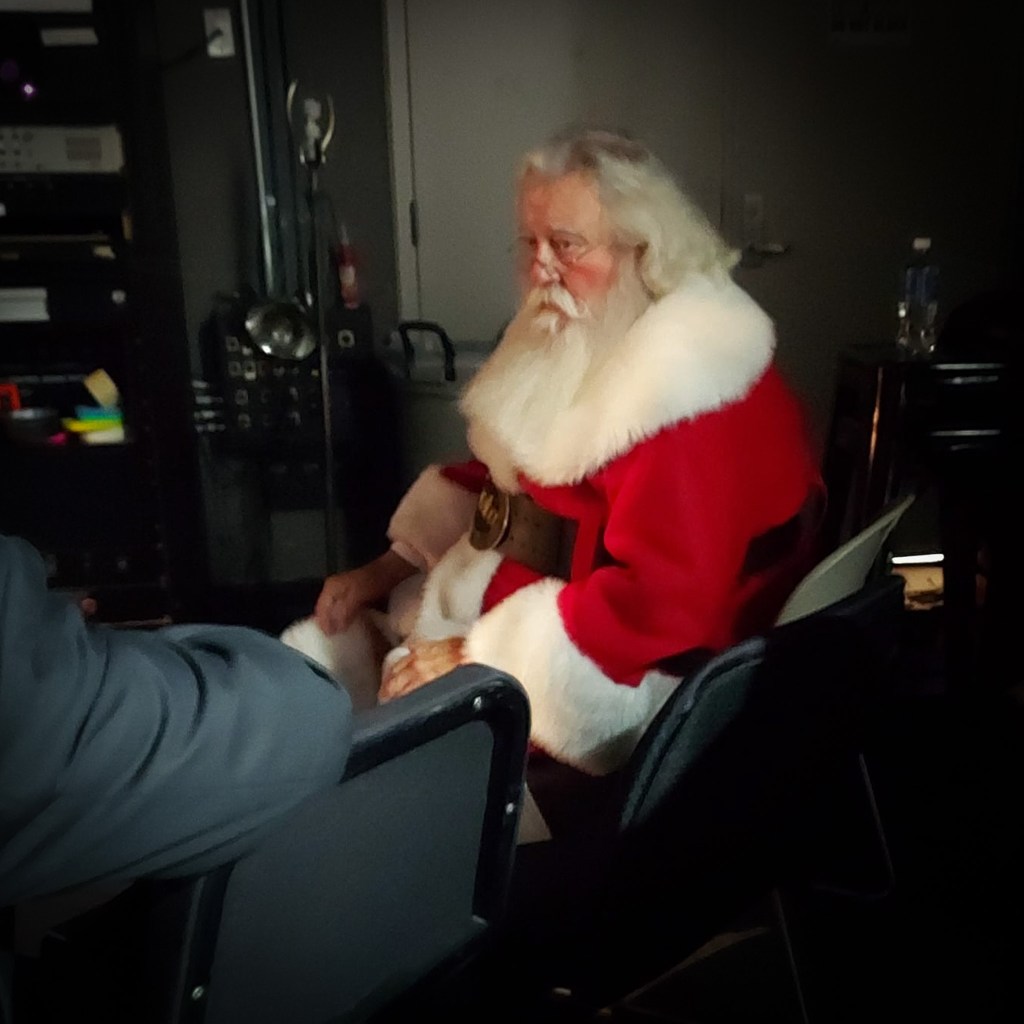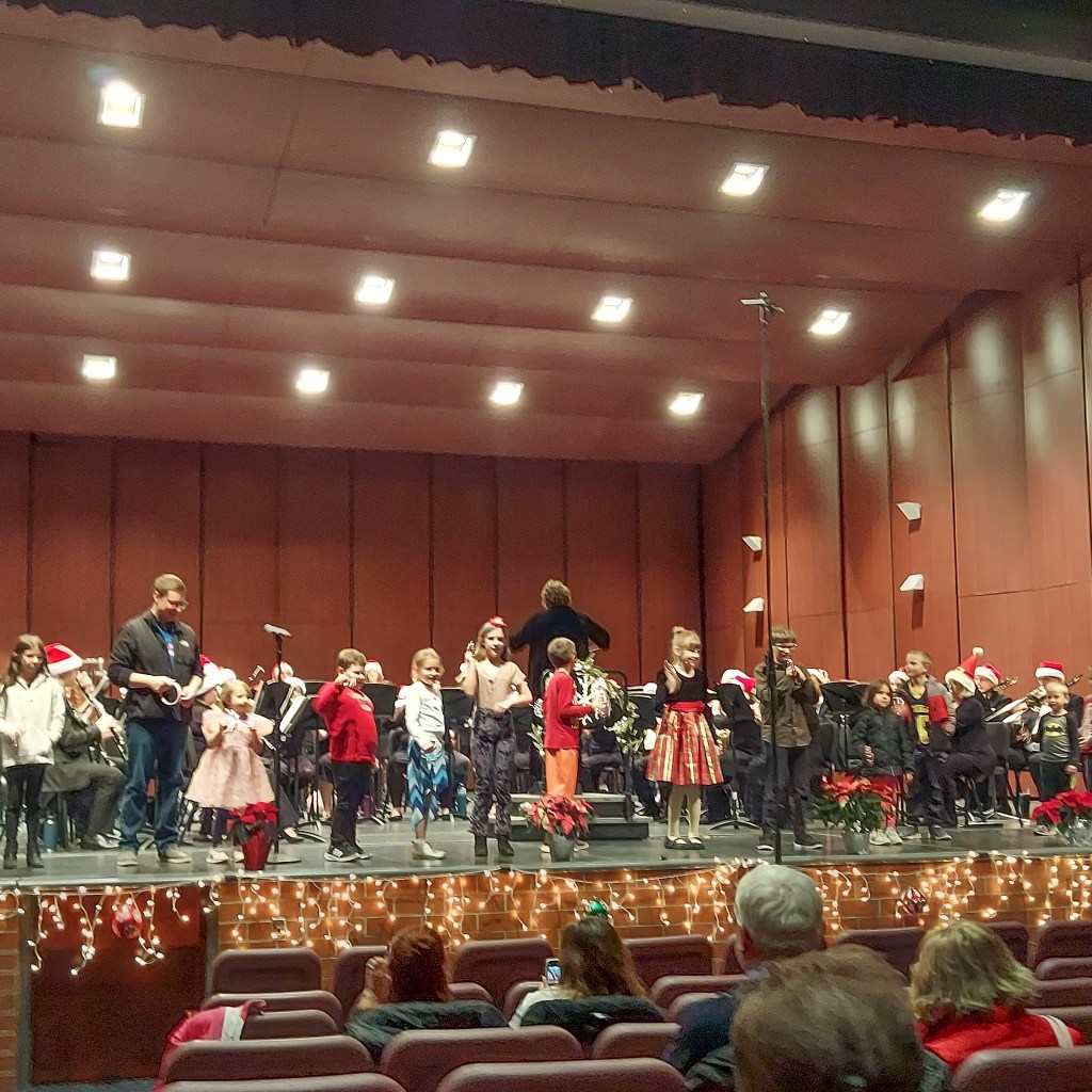 Yep, Friday night we filled that auditorium with love. Toward the end of the show lots of children came up on stage to ring jingle bells as we played “Here Comes Santa Claus” in the hope they could convince Santa to stop in for a visit. These kids were very convincing, and Santa showed up right on cue. Their faces, when they realized he was standing right behind them, were priceless.