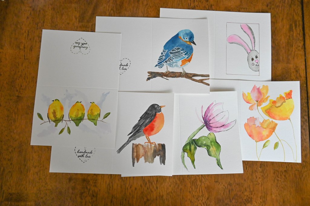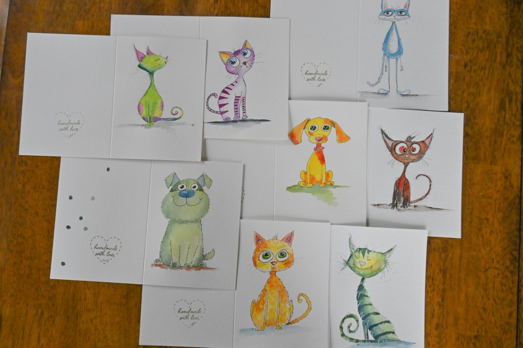 Now I’m debating. Should the next set of cards be whimsical cats and/or dogs? Or should I do flowers and birds like I usually do? Or, should I do a set of birthday cards? What do you think will get the best bids?