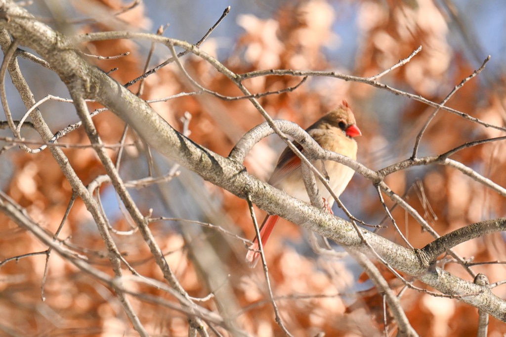 Then I moved as swiftly as I could away, climbing a hill and making a couple turns as soon as I could to put some space between me and them. I found myself next to another thicket that had all sorts of birds, including a cardinal couple.