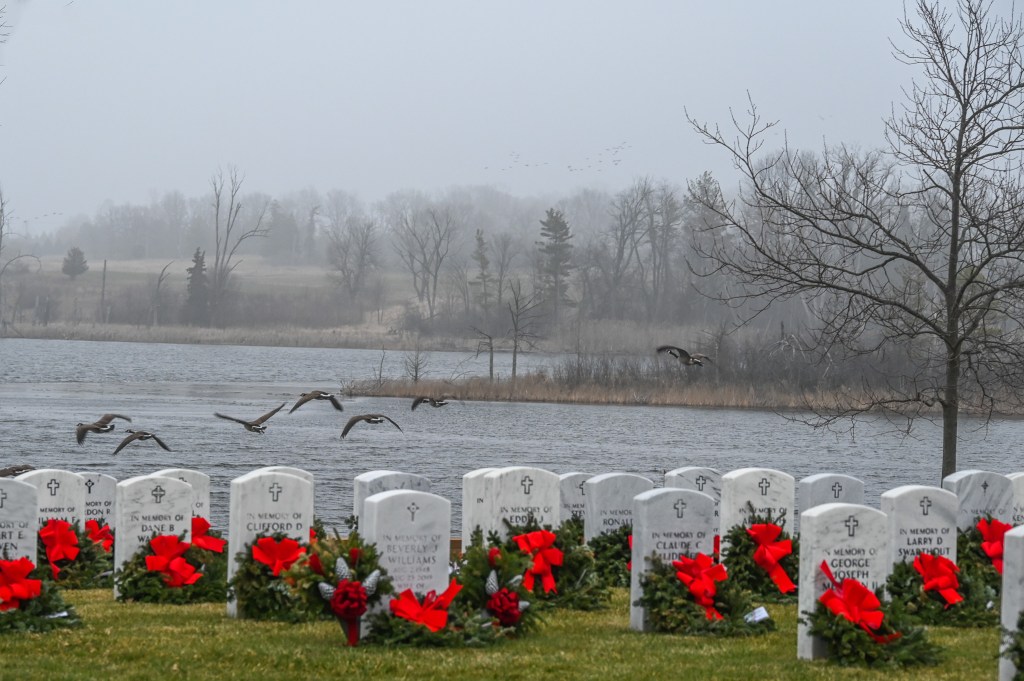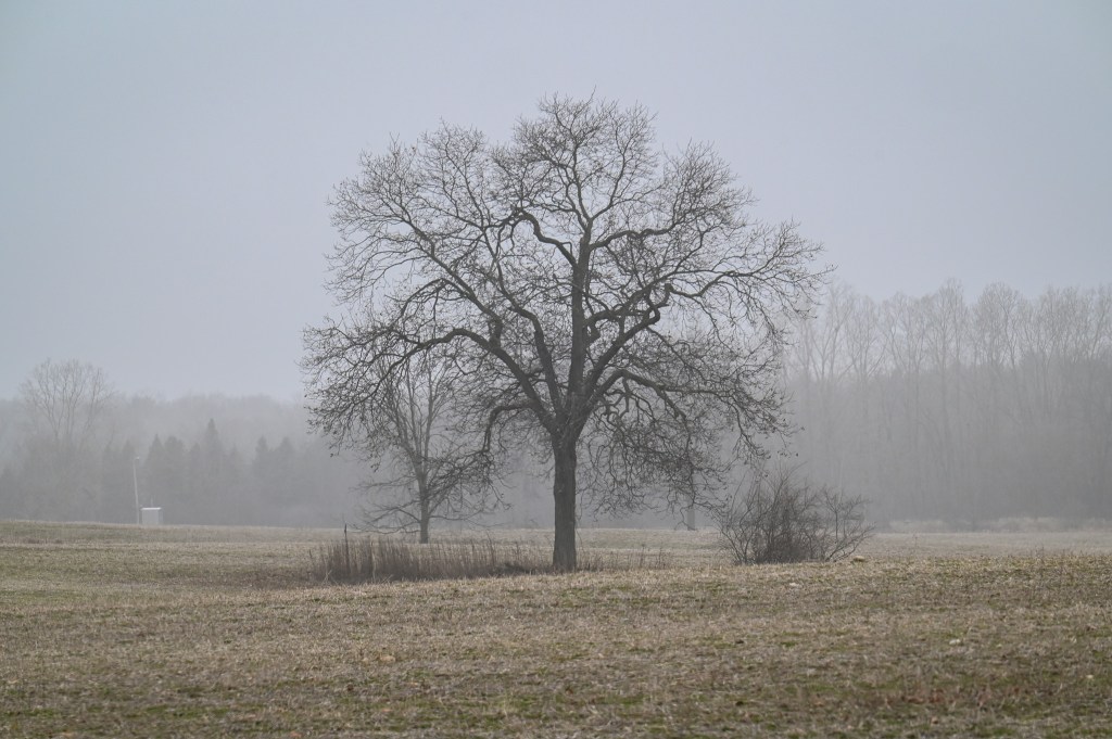 As I was driving I thought about the eagles that have been seen out at the Veterans’ Cemetery. There’s some huge, dead trees that make perfect eagle roosts. What are the odds those eagles were sitting out there in the fog waiting for me?