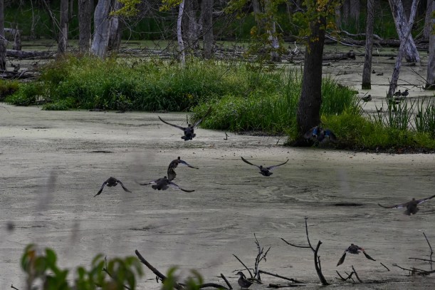I crept along as well, because the trail was covered in crushed stone and my heavy, waterproof shoes were so noisy on the rock that every few steps ducks rose up from the water on either side of the dike I was walking on. The noise of their flight up out of the water is startling, even after I heard it a few dozen times.