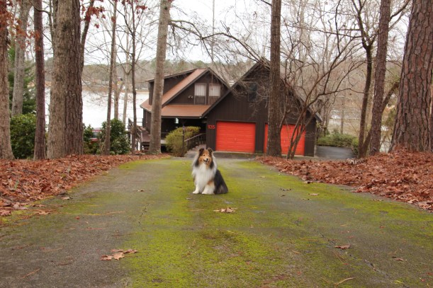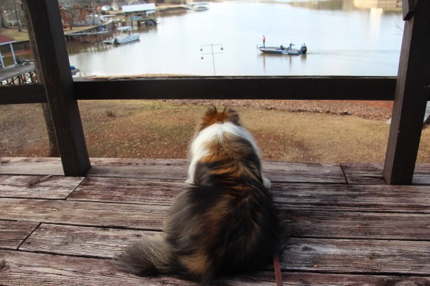 Well, as you know, we eventually got to the lake house. We immediately explored the back yard and I marked it as mine. Mama wanted me to sit on the dock so she could get me and the clouds that were reflected in the still water. But just as she set me up a boat came roaring down the shoreline. She tried to get the picture quick before the water was disturbed, but I wouldn’t look at her. So this is what we got. Mama gets aggravated sometimes, but never with me.