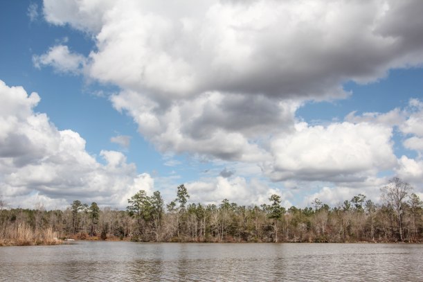 Then we turned around and slid as quietly as we could back down the creek to the larger waters of the lake. The clouds were piling up in the blue sky.