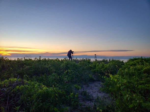 As evening approached we noticed a bank of clouds hanging low along the horizon. But we hopefully set up down on the beach, me with my camera, my friend with her telescope.