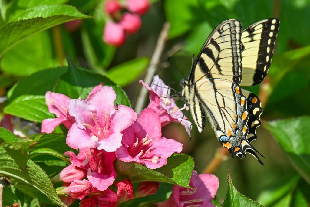 Yep…a butterfly! Mom had been out taking pictures of it earlier, from a good distance away because she didn’t want to scare it off. And then, when she thought it was gone, she took me out there to get my picture with the blooms, and the butterfly flew right around our heads and settled down eating and drinking.
