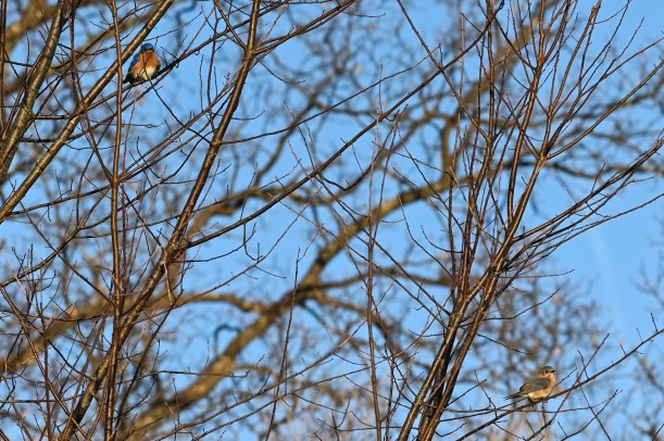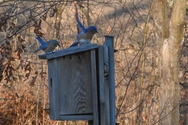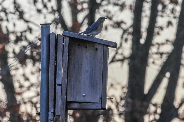 I ended up with a bunch of really bad pictures of this bluebird couple who were checking out a housing unit together. When I first saw them they were both fluttering around the house opening. The light was bad and I couldn’t see anything through the viewfinder, so I just kept clicking.