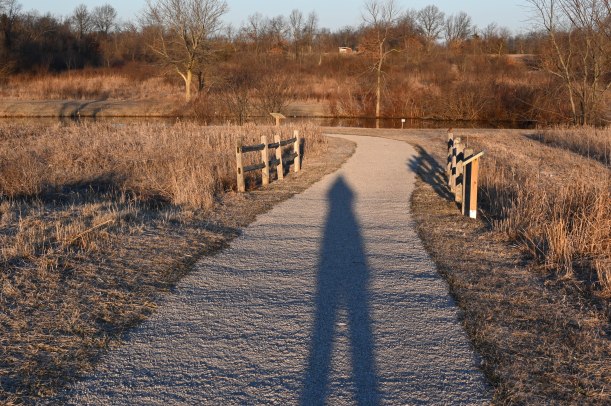 Then I noticed my shadow stretched out long in the early morning light and was so busy capturing it that I didn’t notice that robin on the last fence post to the right. He would have made a nice picture, shining red in the sunlight.