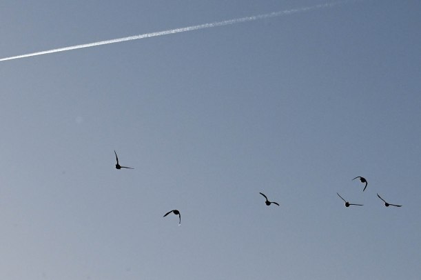 It was hard trying to capture them as they flew in and out of the sun now blazing down on Katie’s little park. But I liked the way they looked against the sky so I kept trying.