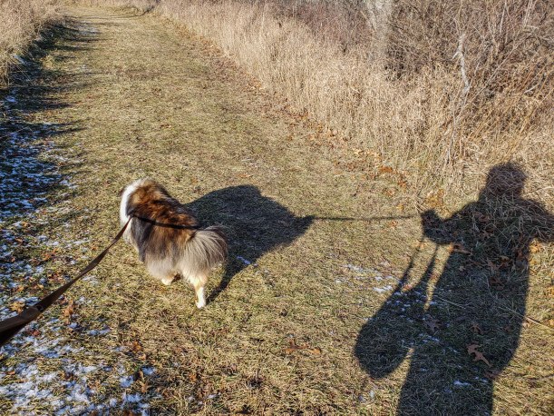 I like to walk on the opposite side of the path than mama walks on, just on principle, and she’s worried about me tripping up somebody going by. Not to mention my propensity for barking and lunging at all moving objects within range of my mama.