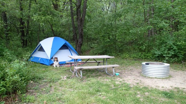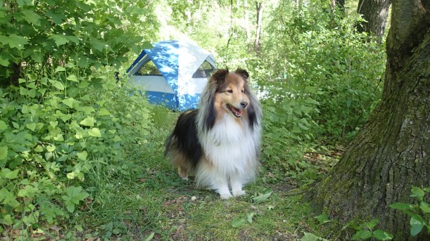 I was lucky to score a site that, though small, had a spot to tuck the tent under some shade trees. It lacked grass, but that’s the price you often pay to have shade. And Katie, though she’s a princess, doesn’t mind hanging out on dirt.
