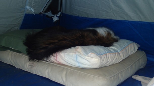 Our second night in the tent was miserable. For me anyway. Temps dropped to 43 degrees (6.11C). I wore all my clothes, doubled up the blankets, pulled the sweatshirt hood up over my ears. Still it was too cold to sleep. Katie, on the other hand, thought it was perfect and snoozed the night away.